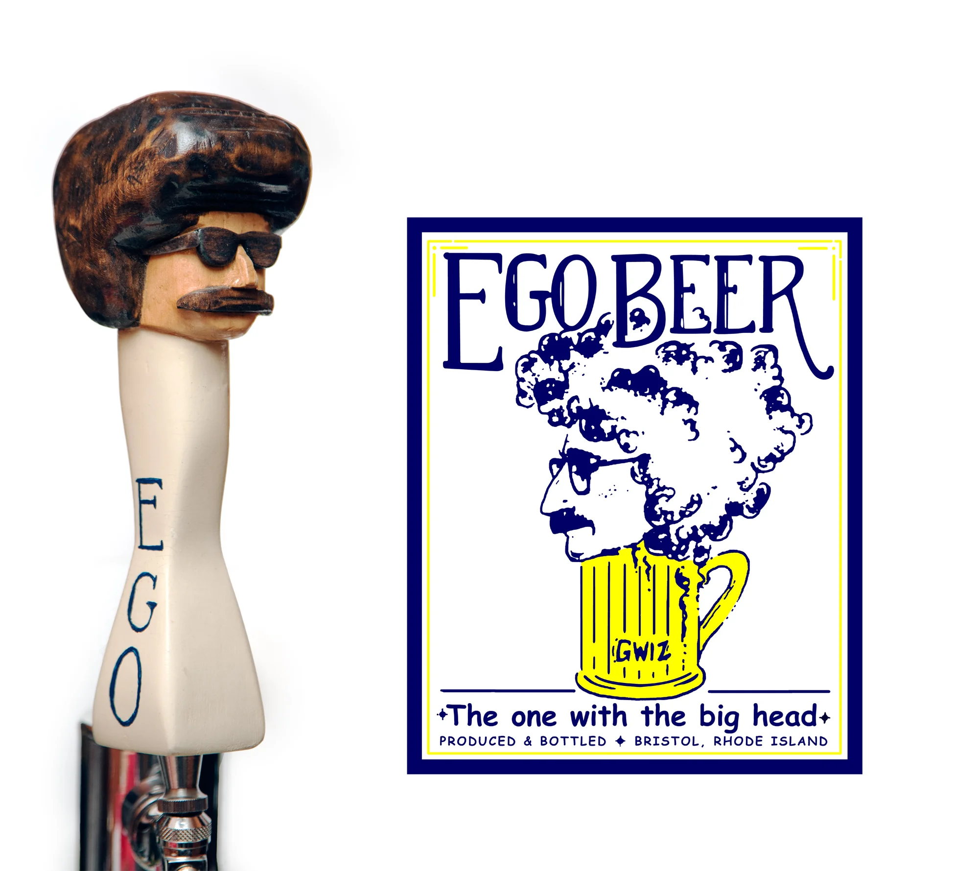This was my first tap handle, created for my dad's birthday in 2008. He used to brew his own beer under the title of “Ego Beer”. The tap handle is based of his original logo/ his face.